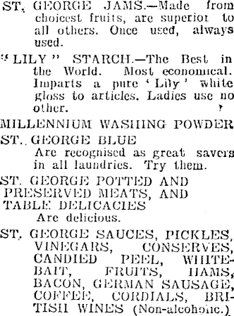ST, GEORGE JAMS.—Made from choicest fruits, arc superior to all others. Ouce used, always used. LILY ” STARCIL—The Best in the World. Most economical. Imparts a pure 1 Lily ’ white gloss to articles. Ladies use no other. r MILLENNIUM WASHING POWDER ST. GEORGE BLUE Are recognised as great savers in all laundries. Try them. ST. GEORGE POTTED AND PRESERVED MEATS, AND TABLE DELICACIES Are delicious. ST. GEORGE SAUCES, PICKLES VINEGARS, CONSERVES, CANDIED PEEL, WHITEBAIT, FRUITS, HAMS, BACON, GERMAN SAUSAGE, COFFEE, CORDIALS, BRITISH WINES (Non-alcohpiic.)