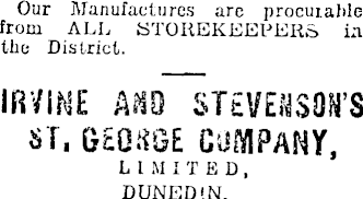 Our Manufactures are procurable from ALL STOREKEEPERS in the District. IRViMH AMO STEVENSON'S Si, GtQSGE CiiIVIPANY, LIMI T E D , DUNEDIN.