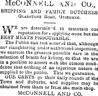 MoCuNNKL'L \Ni.» CO., SHIPPING AND KAMI GY BUTCHEKS GLADSTONE iiOAD, GISBOHNE. WE are determined to maintain our reputation for t jpnlriag none but the BEST MEATS PKOCUiiAJBLE. The Public can real assur jd that, although slaughtering under authorised inspection, we exercise the greatest possible care in the 3oleotion of beasts for killing, so that we are in a position to assert With the utmost confidence that nothing of an injurious nature is supplied to the public. This we guarantee. OUB CAKTS go their daily rounds of ths Town and Suburbs, and supplies may be obtained from them or frem the main shop. McConnell and co.