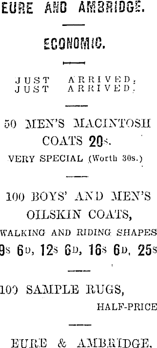 ECONOMIC. JuSI'AR R I V E D . JUS T ARRIVED . 50 MEN’S MACINTOSH COATS 20>VERY SPECIAL (Worth 305.) 100 BOYS’ AND MEN’S OILSKIN COATS, WALKING AND RIDING SHAPES, 9s 6u, 12s Qd, 16s 6i>, 255. 100 SAMPLE HUGS, HALF-PRICE. EIJHE & AMBBIDGE.