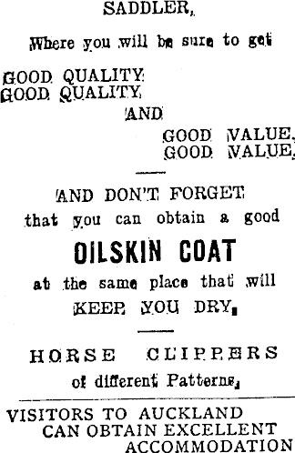 SADDLER,. SVhere you .will b* sure to get POOD. QUALITY GOOD. QUALITY, AND .GOOD iVALUE, GOOD KALUEAND DON’T FORGET that you can obtain a good OILSKIN COAT at the same place that, will ■KEEP, YOU DRY, HORSE CLIPPERS o! different Pattern^ VISITORS TO AUCKLAND CAN OBTAIN EXCELLENT ACCOMMODATION