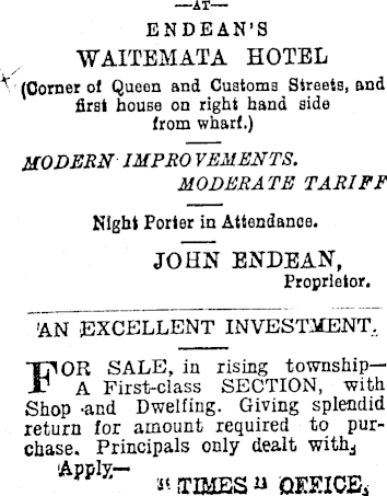 —AT—ENDEAN’S WAITEMATA HOTEL (Gorner ol Queen and Customs Streets, and first bouse on right band side from wharf.) MODERN IMPRO VEMENTS. MODERATE TARIFF Night Porter in Attendance. JOHN ENDEAN, Proprietor. ~AN EXCELLENT INVESTMENT, For SALE, in rising township— A First-class SECTION, with Shop -and Dwelfing. Giving splendid return for amount required to purchase. Principals only dealt with d Appl7 ~ it .TIMES « QEEICEa