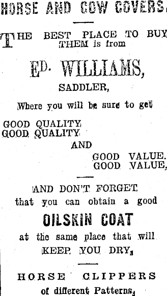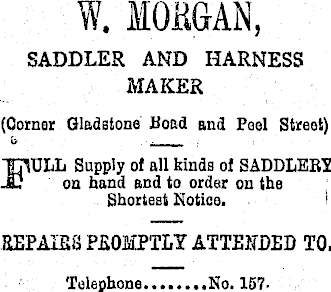 SADDLER AND HARNESS MAKER (Corner Gladstone Hoad and Feel Street) TjTOLL Supply of all kinds of SADDLERY JU on hand and to order on the Shortest Notice. REPAIRS PROMPTLY ATTENDED TO. Telephone. ,No. 157-