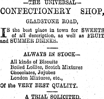-THE UNIVERSAL—CONFECTIONERY SHOP, GLADSTONE ROAD, IS tha beat plaea in town for SWEETS of all description, as weii as I‘TtUIT and SUMMER DRINKS. ALWAYS IN STOCKAll kinds of Biscuits Boiled Lollies, Scotch Mixtures Chooolatea, Jujubes London Mixtures, eto., 01 the VERY BEST QUALITY. A TRIAL SOLICITED.
