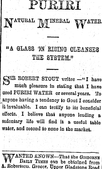PUBIJM "A GLASS ON RISING CLEANSES TEE SYSTEM." QIR ROBERT STOUT writes -»I have much pleasure in stating that I have used PURIRI WATER or several years. To anyone having a tendency to Gout I consider it invaluable. I can testily to its benefioial elleets. I believe that anyone leading a sedentary life will find it a useful table water, and second to none in the market. WANTED KNOWN— That the Gisbobxe Daxlv Times oan be obtained from A. Robertson. Grooor. Uuoor Gladstone Road