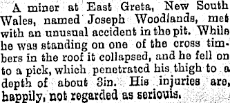 A miner at East Greta, New South Wales, named Joseph Woodlands, met with an unusual accident in the pit. While he was standing on one of the cross timbers in the roof it collapsed, and he fell on to a pick, which penetrated his. thigh to a depth of about 3in. His injuries are, happily, not regarded as seriouis.