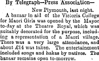 By Telegraph—Press AssociationNew Plymouth, last night. A bazaar in aid of the Victoria College for Maori Girls was opened by the Mayor to-day at the Theatre Royal, which was suitably docorated for the purpose, including a representation of a Maori village. There was a very largo attendance, and about £l4 was taken. The entertainment included songs and hakas by natives. The bazaar remains open to-morrow.