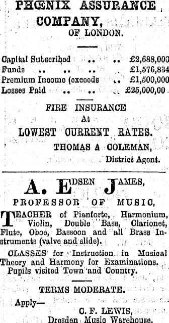 FHtENIX ASSURANCE COMPANY, OF LONDON. Capital Subscribed .. .. £2,688,000 Funds .. .. .. .. £1,676,834 Premium Income (exceeds £1,600,000 Losses Paid £26,000,00 FIDE INSUBANCE At LOWEST OUBEE&T BATES. THOMAS A COLEMAN, Distriot Agent. PBOFESSOB OF MUSIC, TEACHEB ol Pianforte, Harmonium, Violin, Double Bass, Clarionet, Flute, Oboe, Bassoon and all Brass Instruments (valve and slide). CLASSES' lor ' Instruction, in Musioal Theory and Harmony for Examinations. Pupils vißited Town‘and Country. TEBMS MODEBATE. Apply— C. F. LEWIS, Dresden Musio Warehouse.