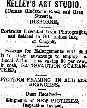 KELLEY’S ART STUDIO. iCtonuK Gladstone Road aid Gr«* Street), GISBORNE, Portrait* Executed Iron PhotografflUL aid finished in Oil, Indiaa Ink, on Crayon, Patron* ior Enlargement* win Knd ill to their advantage to employ a Local Artist, thus saving 60 per cent In cost* SATISFACTION GUARANTEED, PICTURE FRAMING IN ALU ITS BRANCHES, SJari Received— Bhlpmint of NEW PICTURES, Inspection invited,
