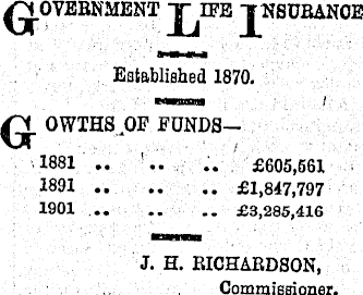 Gr OVEBNMENT JJNSUBANOE Established 1870. Gr OWTHSPP FUNDS—--1881 .. .. .. £605,561 1891 £1,847,797 1901 £3,285,416 J. H. RICHARDSON, Commissioner.