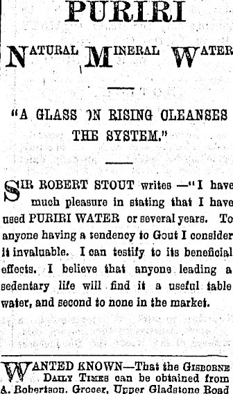 PUEIEJ ATER. “A GLASS IN RISING CLEANSES THE SYSTEM." QIR ROBERT BTOIJT writes -“I have muoh pleasure in Btating that I have used PURIBI WATER or several years. To anyone having a tendenoy to Gout I consider it invaluable. I can testily to its benefioial effects. I believe that anyone leading a sedentary life will find it a uselul table water, and seoond to none in the market. "ANTED KNOWN—That the Giseobne Daily Tikes can be obtained from 4. Bobertann. Grocer, Upper Gladstone Road