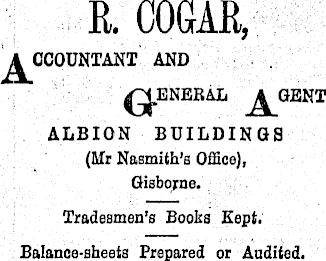 R. COGAR, CCQUNTANT AND QENEBAL GENT ALBION BUILDINGS (Mr Nasmith’s Office), Gisborne. Tradesmen’s Books Kept. Balance-sheets Prepared or Audited.
