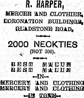 R. HARPER, MERCER AND CLOTHIER!, CORONATION BUILDINGS, GLADSTONE ROAD, 2000 NECKTIES (NOT 200). BEST iWADUffI BEST m ALU® i-^N-4 MERCERY AND CLOTHINC! MERGER'S AND DLOTEQUa HOI TOMS**