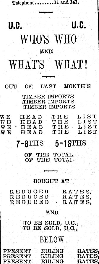 Telephone. ,11 and 141. U.C. U.C. WHO’S WHO and WHAT’S WHAT! OUT OB! LAST MONTH’S TIMBER IMPORTS TIMBER IMPORTS TIMBER IMPORTS E HEAD E HEAD E HEAD E HEAD THE LIST THE LIST THE LIST THE LIST 7-BTHS 5-ISTHS OP THE TOTAL. OF THE TOTAL. BOUGHT AT REDUCED RATES, REDUCED RATES* REDUCED RATES, AND TO BE SOLD, U.C., rro be sold, UAg PRESENT PRESENT PRESENT BELOW RULING RULING RULING RATES, RATES, RATES,