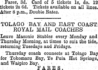 Fares, 3d. Card of 5 tickets Is, do. 12 tickets 2s 6d. Tickets available on all lineß. After 8 p.m., Double Bates. TOLAGO BAY; AND EAST COAST, KOYAL MAIL COACHES Leave Masonic Stables every Monday and Thursday Morning, at times to suit the tide, returning Tuesdays and Fridays. Thursday coach connects at Tolago Bay for Tokomaru Bay, Te fuia Hut Springs, and Waipiro Bay. FABES.