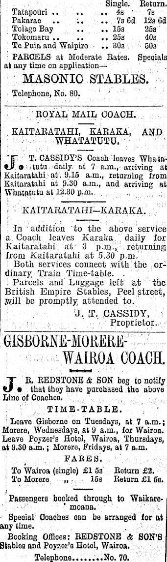 Single. Return. Tatapouri .. .. .. 4s 7s Pakarae .. .. .. 7s 6d 12s 6d Tolago Bay .. .. 15s 25s Tokomaru 25s 40s Te Puia and Waipiro .. 30s 50s PARCELS at Moderate Rates. Speoials at any time on application— MASONIC STABLES. Telephone, No. 80. ROYAL MAIL COACH. KAITARATAHI, KARAKA, AND WHATATUTU. JT. CASSIDY’S Coaoh leaves Whata--9 tutu daily at 7 a.m., arriving at Kaitaratahi at 9.15 a.m., returning from Kaitaratahi at 9.30 a.m., and arriving at Whatatutu at 12.30 p.m. KAITARATAHI—KARAKA. In addition to the above service a. Coach leaves Karaka daily for Kaitaratahi at 3 p.m., returning from Kaitaratahi at 5.30 p.m. Both services connect with the ordinary Train Time-table. Parcels and Luggage left 'at the British Empire Stables, Peel street, Will be promptly attended to. j. ;r. .Cassidy, Proprietor. GISBOME-MOMM-WAIHQA COACH. JR. REDSTONE & SON beg to notify 9 that they havo purchased the above Line of Coaohes. TIME-TABLE. Leave Gisborne on Tuesdays, at 7 a.m.; Morere, Wednesdays, at 9 a.m., for Wairoa. Leave Poyzer’s Hotel, Wairoa, Thursdays, at 9.30 a.m.; Morere, Fridays, at 7 a.m. FARES. To Wairoa (single) £1 5s Return £2. To Morere „ 15s Return £lss. . Passengers booked through to Waikare- ' moana. Special Coaohes oan be arranged for at any time. Booking Offices; REDSTONE & SON'S Stables and Poyzer’s Hotel, Wairoa. Telephone ..No. 70.