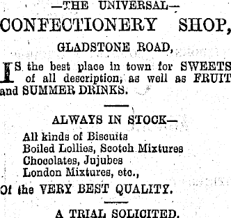 —THE UNIVERSAL—CONFECTIONERY SHOP, GLADSTONE ROAD, iS the best place in town lor SWEETS of all description* as well as FRUIT and SUMMER DRINKS. ALWAYS IN STOCK— All kinds ol Biscuits Boiled Lollies, Sootoh Mixtures Chocolates, Jujubes London Mixtures, eto., 01 the VERY BEST QUALITY. A TRIAL SOLICITED.