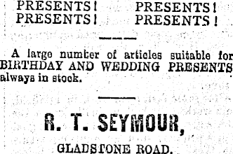 PRESENTS I PRESENTS 1 PRESENTS I PRESENTS! A largo number of articles suitable for BIRTHDAY AND WEDDING PRESENTS always in stock. R. T. SEYMOUR, GLADSTONE ROAD.