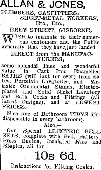 ALLAN & JONES, PLUMBERS, GASFITTERS, SHEET-METAL .WORKERS, Etc., Etc.,.GREY STREET, GISBORNE,WISH to intimate to their numerous customers and the Public generally that they have ; just landed DIRECT from the MANUFACTURERS., some splendid lines and wonderful value in Cast Iron Enamelled BATHS (will last for ever) from £5 10s, Porcelain Lavatories, and Ax- 1 tistic Ornamental Stands, Electroplated and Solid Nickel Lavatory and Bath Cocks and Fittings (all latest Designs), and at LOWEST PRICES. Nice line of Bathroom TIDYS (Indispensible in every bathroom). Also,— Our Special ELECTRIC BELL SETS, complete with Bell, Battery, Press Button, Insulated Wire and Staples, all for 10s 6d. Instructions for Fitting .Gratis.-
