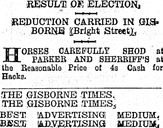 RESULT OE ELECTION, REDUCTION CARRIED IN GIS. BORNE Street^ HOBSES CAREFULLY SHOD at PARKER AND SHERRIFF'S at the Reaaonabla Price of 4s Cash for Haohs. THE GISBORNE TIMES. THE GISBORNE TIMES^ BEST, advertising; MEDIUM. BEST ADVERTISING MEDIUM,