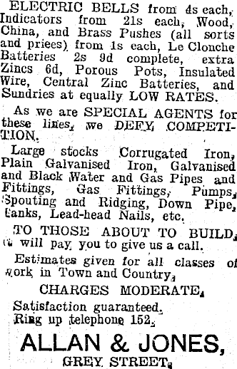 ELECTRIC BELLS from 4s each, Indicators from 21s each* Wood, China, and Brass Pushes (all sorts and priees) from Is each, Le Clonche Batteries 2s 9d complete, extra Zincs 6d, Porous Pots, Insulated Wire, Central Zinc Batteries, and Sundries at equally LOW RATES. As we are SPECIAL AGENTS for WON lißeSj! lWe COMPETILarge stocks .Corrugated Iron, Plam Galvanised Iron,. Galvanised and Black Water and Gas Pipes and Fittings, Gas Fittings, Pumps, ■spouting and Ridging, Down Pipe, tanks, Lead-head Nails, etc. .TO THOSE ABOUT TO BUILD, it will pay you to give us a call. Estimates given for all classes of york in Town and Country, CHARGES MODERATE, Satisfaction guaranteed. Ring up telephone 152," ALLAN & JONES, GREY STREETg