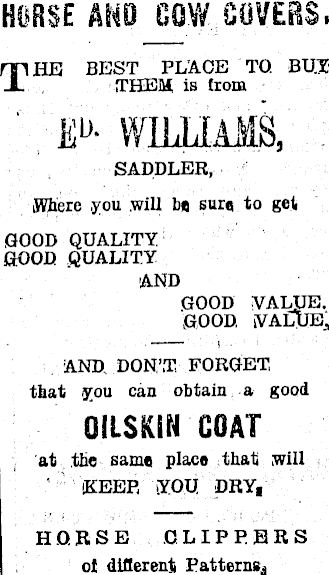 HORSE AND DOW COVERS. The best place to. buy THEM; is trom P- WILLIAMS, SADDLER, Where .you .will bit sure to get GOOD QUALITY GOOD QUALITY AND GOOD VALUE. GOOD. VALUE, AND. DON’T. FORGET, that you can obtain a good OILSKiN GOAT at the same place that will KEEP, YOU DRY, HORSE CLIPPERS of different Patterns^
