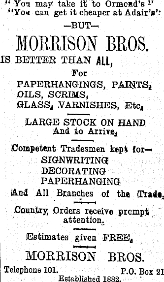 “ Yoi may take It to Ormond's a ’ “You can get it cheaper at Adair’s’: -BUTMORRISON RROS. IS BETTER THAN ALL, For PAPERHANGINGS, PAINTS* OILS, SCRIMS, GLASS* .VARNISHES, Etc, LARGE STOCK ON HAND And to Arrive, Competent Tradesmen kept for— SIGNWRITING DECORATING PAPERHANGING And All Branches ol the Trade* .Country, Orders receive prompt attention. Estimates given FREE, MORRISON BROS. Telephone 101. p.O. Bos 21. Established 1882.