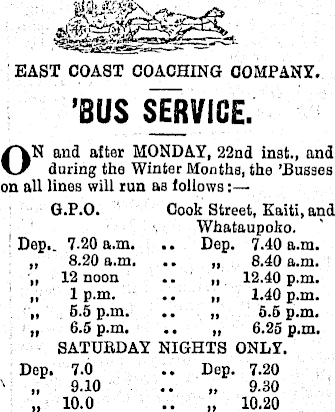 EAST COAST COACHING COMPANY. ’BUS SERVICE. ON and alter MONDAY, 22nd inst., and daring the Winter Months, the ’Busses on all lines will run as follows: G.P.O. Dep.. 7.20 a.m. 8.20 a.m. 12 noon 1 p.m. 5.5 p.m. 6.5 p.m. Cook Street, Kaiti, and Whataupoko. .. Dep. 7.40 a.m. 8.40 a.m. 12.40 p.m. 1.40 p.m. 5.5 p.m. 6.25 p.m. SATUBDAY NIGHTS ONLY. Dep. 7.0 .. Dep. 7.20 „ 9.10 .. „ 9.30 „ 10.0 .. „ 10.20