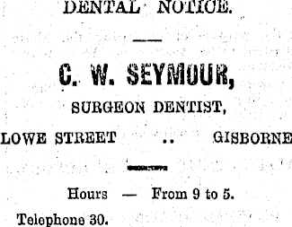 DJMTAL NUTIG'B. G. W. SEYMOUR, SURGEON DENTIST, LOWE STREET .. GISBORNE. Hours Telephone 30. From 9 to 5.