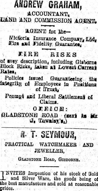 ANDREW GRAHAM, ACCOUNTANT, LAND AND, .COMMISSION AGENT* AGENT toe She—tVlcforia Insurance Company, LSd, Eire and Fidelity Guarantee, *SiBB RISES of Bvey description, including Gisborne Block Ricks,, taken at Lowest Cnrrent Rat#*, Policies issued Guaranteeing th* integrity of Employees in Positions Of UiEUStI Prompt and Liberal Snitlemeni ol Claims. OKUIQi: GLADSTONE ROAD {next An Hx Ji Towmlsy/iD i- I- SEYMm, PRACTICAL WATCHMAKER AND JEWELLER, Gladstone Road, Gisbobnb. INVITES Inspeetion of his stook of Gold and Silver Ware, the goods being of the best manufacture and sold at reasonable prides.