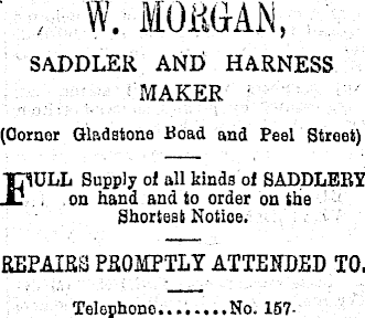 ■ , W. MOiiG-AM, SADDLER ANI> HARNESS MAKER ' (Corner Gladstone Hoad and Peel Street) F ULL Supply oI all kinds ol SADDLERY on hand and to order on the Shortest Notice. REPAIRS PROMPTLY ATTENDED TO. Telephone, ,No. 157-