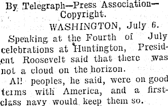 By Telegraph—Press AssociationCopyright. WASHINGTON, July 6, Speaking at the Fourth oi July celebrations at 'Huntington, President Roosevelt said that there was not a cloud on the horizon. All peoples, he said, were on good terms with America, and a firstclass navy would keep them so.
