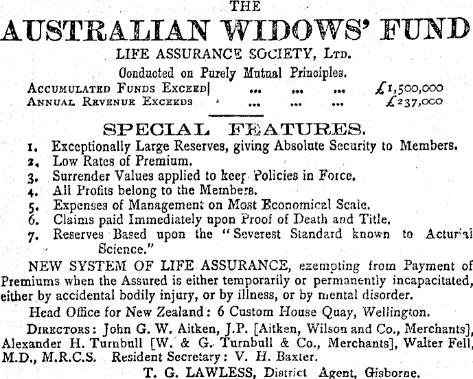 THE AUSTRALIAN WIDOWS’ FUND LIFE ASSURANCE SOCIETY, Ltd. Conducted on Purely Mutual Principles. Accumulated Funds Exceed| ... ... ... £1,500,000 Annual Revenue Exceeds * ... ... ... £237,000 SPECIAL FEATURES, 1. Exceptionally Large Reserves, giving Absolute Security to Members. а. Low Rates of Premium. 3. Surrender Values applied to keep Policies in Force. 4. All Profits belong to the Members. 5. Expenses of Management on Most Economical Scale. б. Claims paid Immediately upon Proof of Death and Title, 7. Reserves Based upon the “ Severest Standard known to Acturai Science.” NEW SYSTEM OF LIFE ASSURANCE, exempting from Payment of Premiums when the Assured is either temporarily or permanently incapacitated, either by accidental bodily injury, or by illness, or by mental disorder. Head Office for New Zealand: 6 Custom House Quay, Wellington. Directors: John G. W. Aitken, J.P. [Aitken, Wilson and Co., Merchants], Alexander H. Turnbull [W. & G.- Turnbull & Co., Merchants], Walter Fell, M.D„ M.R.C.S. Resident Secretary: V. H. Baxter. T. G. LAWLESS, District Agent, Gisborne.