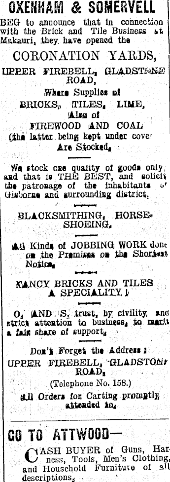 OXEKKAM & SOMERVELL BEG to announce that in connection with the Brick and Tile Business st M&kauri, they, have opened the CORONATION YARDS, LIBBER FIREBELL, GLADSTONE ROAD, Where Suppliee Hi BRICKS* TILES, LIME, Also ol FIREWOOD AND COAL (the latter being kept under cove/ Are Stocked, Wa stock one quality ol goods only, and that is THE BEST, and solicit the patronage ol the inhabitants s' Gisborne and surrounding district, BLACKSMITHING, HORSE" SHOEING, AD Kinds of JOBBING WORK done on the Premises on the Shortest Notice, ffANCY BRICKS AND TILES A SPECIALITY, i 0, AND IS, .trust, by civility and strict attention to business, to mnrtt a lain share of support, Don’t Forget the Address i UPPER FIREBELL, GLADSTONE ROAD, (Telephone No. 158.) All Orders lon Carting promptly attended to, GO TO ATTWOODCi ASH BUYER of Guns, Harj ness, Tools, Men’s Clothing, and Household Furniture of all descriptions,