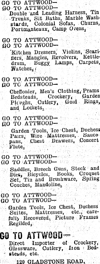 GO TO ATTWOOD—GO TO ATTWOOD— Double and Leading Harness, Tin Trunks, Sit Baths, Marble .Washstards, Colonial Sofas, Churns, Portmanteaux, Camp O rens* GO TO ATTWOOD—GO TO ATTWOOD—'Kitchen Dressers, Violins, Scarifiers, Mangles, Revolvers, Kettledrum, Buggy; Lamps, Carpets, Watches* < GO TO ATTWOOD—GO TC ATTWOOD— Chefionier, Men’s Clothing* Prams Bedsteads, Crockery* Garden Plcvghs, Cutlery, Gold Rings, and Lockets. GO TO ATTWOOD—GO TO ATTWOOD— Garden Tools, Ice Chest, Duchess Pairs, Wire Mattresses, Saucepans, .Chest Drawers, .Concert Flute* GO TO ATTWOOD—GO TO ATTWOOD— Saddles, Breech Guns, Stock and Dies* Bicycles, Books, Croquet Set, Tin and Brushware, Spring Couches, Mandoline* GO TO ATTWOOD—GO TO ATTWOODGarden Tools, Ice Chest, Duchess Suites, Mattresses, etc., carefully Recovered. Picture Frames Regilded* GO TO ATTWOOD— Direct Importer of Crockery, Glassware, Cutlery, Iron > Bed- ' steads, etc. 129 GLADSTONE ROAD,