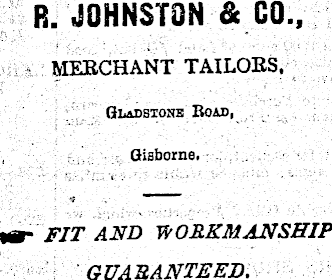 R. JOHNSTON & CO., MERCHANT TAILORS. Gladstone Road, Gisborne. FIT AND WORKMANSHIP GUARANTEED.