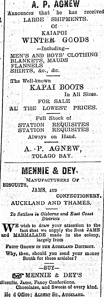 Announces that ’he has received LARGE SHIPMENTS. Of KAIAPOI WINTEJK, GOODS —lncluding MEN’S AND BOYS’ CLOTHING BLANKETS, MAUDS FLANNELS SHIRTS, &c., &c. The Well-known KAPAI BOOTS , In All Sizes. FOR SALE fAT.’ ,THE LOWEST. PRICES. Full Stock of STATION REQUISITES STATION REQUISITES Always on Hand. A. P. AGNEW, TOLAGO BAY. MEBNIE & DEYi Manufacturers Of ' BISCUITS, JAMS, and CONFECTIONERY. AUCKLAND AND THAMES. To Settlers to Qisbame and East Coast Districts TTTTE wißh to draw your attention to the f! faot that we supply the Boat JAMS and MARMALADE made in the oolony, largely from Fecit Gbown is the Auckland District. Why, then, should you Bend your money South for these artioles ? ■ —BUY— ' fifsoults, Jams, Fancy Confections, Chooolates, and Sweets of every kind. He d Office; Aujeet St., Auckland.