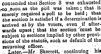 contended that Section 3 was exhausted .■eajjoou a s the poll was taken ; that it merely required a poll to be held; that the section is satisfied if a determination is arrived at by the voters, even if afterwards upset; that the seotion must be aubjeot to sections implied by other provisions of the statute, suoh as default of the returning officer. Later.—Mr Skerrett, continuing his
