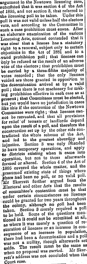 argument in the Nowtown licensing case, subufltted that it was section 4 of the Act of 1895, and not section 3, that referred to the licensing poll to be taken. Under this poll it was not valid unless half the electors vote, and according to the Committee in such a cuse prohibition must ensue. After an elaborate examination of the various Licensing Aots, counsel contended that it was clear that a license has a statutory right to a renewal, subject only to certain objections in the Act of 1881 and to a .valid prohibition poll; that licenses can only be refused as the result of an adverse vbte of the eleotors ; that prohibition must be carried by a three-fifths majority of votes recorded; that the only licenses voided are those granted in opposition to the determination arrived at by a valid poll 5 that there is not machinery for making prohibition effective in each case as at present; that Committees must be olect6d, but yet would have no jurisdiction in cases like this if the contention of the Newtown Committee were right; that licenses cannot be recreated, and that all provisions for reliof of tenaats or landlords depend upon the roault of a poll, and therefore the construction set up by the othor side contradicted the whole scheme of the Act, and led to the greatest absurdity and injustice. Section 3 was only intended to have temporary operations, and apply to districts existing when it came into operation, but not to those afterwards formed or altered. Section 4of the Act of 1895 covered the whole matter, and the presumed'existing state of things where fhere had been no poll, or no valid poll. & Skerrett further argued from the Electoral and other Acts that the results of committee’s contention must be that under certain circumstances no licenses could be granted for two years throughout the colony, although no poll had been taken. Section 3 merely required a poll to bo held. Some of the questions mentioned in it could not bo submitted at ail, as where it was merely a question of restoration of licenses or an increase in consequence of an increase in population, there had been a dotormination and a pol was not a nullity, though afterwords set aside. The result must bo the same as When no proposal was carried. Mr Skerrett’s address was not conoludod when the Court rose.