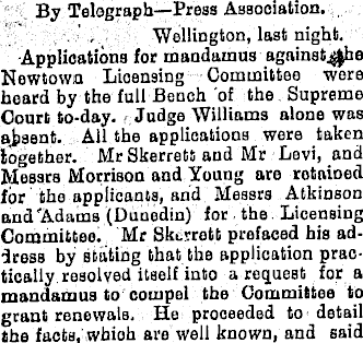 By Telegraph—Press Association. Wellington, last night. Applications for mandamus Newtown Licensing Committee were heard by the full Bench of the Supreme Court to-day. Judge Williams alone was absent. All the applications were taken together. Mr Skerrett and Mr Levi, and Messrs Morrison and Young are retained for the applicants, and Messrs Atkinson and'Adams (Dunedin) for the Licensing Committee. Mr Skerrett prefaced his address by stating that the application practically resolved itself into a request for a mandamus to compel the Committee to grant renewals. He proceeded to detail the facts, whioh are well known, and said