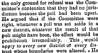 the only ground for refusal was the Committee’s contention that they had no jurisdiction because the poll had been upset. He argued that if the Committee were right, whenever a poll was set aside in a new district, whatever tho result of that poll might have boon, the effect would be prohibition irremediably. This v would apply to every new district ot every district whoso boundaries were altered. » He