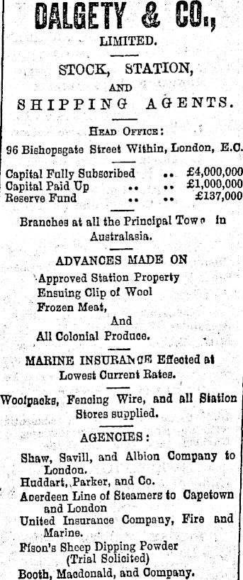 LIMITED. STOCK, STATION, AND SHIPPING AGENTS. Head Office: 96 Bishopsgate Street Within, London, E.C. Capital Fully Subscribed •• £4,000,000 Capital Paid Up .. •• £1,000,000 Reserve Fund .. .. £137,000 Branohes at all the Principal Tow c in Australasia. ADVANCES MADE ON Approved Station Property Ensuing Clip oi Wool Frozen Meat, And All Colonial Produce. MARINE INSURANCE Effeoted at Lowest Current Rates. Wooipaoks, Fenalng Wire, and all Station Stores supplied. AGENCIES: Shaw, Savill, and Albion Company to London. Huddart, Parker, and Co. Aoerdeen Line of Steamers to Capetown and London United Insurance Company, Fire and Marine. Fison’s Sheep Dipping Powder (Trial Solicited) Booth, Maodonald, and Company.