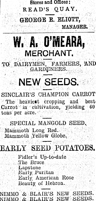 Btores and Offices: READ'S QUAY. GEOBGE E. ELIOTT, MANAGER. W. A. O’MEARA, MERCHANT. TO DAIRYMEN, FARMERS, 'AND GARDENERS. NEW SEEDS. SINCLAIR’S CHAMPION CARROT The heaviest cropping and best Carrot in cultivation, yielding 60 tons per acre. SPECIAL MANGOLD SEED, Mammoth Long Red. Mammoth Yellow Globe, EARLY SEED POTATOES. Fidler’s Up-to-date The Bruce Lapstone Early; Puritan Early American Rose Beauty of Hebron. NIMMO &■ BLAIR’S NEW SEEDS. NIMMO & BLAIR’S NEW SEEDS.