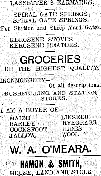 LASSETTER'S EARMARKS, SPIRAL GATE SPRINGS ( SPIRAL GATE SPRINGS, For Station and Sheep Yard Gates. KEROSENE STOVES. KEROSENE HEATERS, GROCERIES OF. THE HIGHEST, QUALITY, IRONMONGERY--01 all descriptions. BUSHFELLING AND STATION: STORES, I AM A BUYER OEMAIZE LINSEED BARLEY RYEGRASS COCKSFOOT HIDES [TALLOW. WOOL W. A. O’MEARA. HAMON & SMITH, HOUSE, LAND AND. STOCK ;