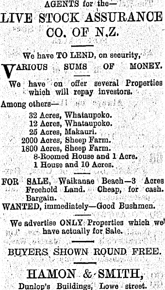 AGENTS for theLIVE STOCK ASSURANCE CO. OR N.Z. We have TO LEND, on seourity, SUMS OF MONEY. We have on offer several Properties which will repay investors. Among others—--32 Acres, Whataupoko. 12 Aores, Whataupoko. 25 Acres, Makauri. 2000 Aores, Sheep Farm. 1800 Acres, Sheep Farm. 8-Boomed Bouse and 1 Aere. 1 House and 10 Aores. FOB SALE, Waikanae Beaoh—3 Aores Freehold Land. Cheap, for cash. Bargain. WANTED, immediately—Good Bushmen. We advertise ONLY Properties which wet ~!' have aotually for Sale. BUYERS SHOWN ROUND. FREE, HAMON~ SMITH, Dunlop’s Buildings, Lowe street.