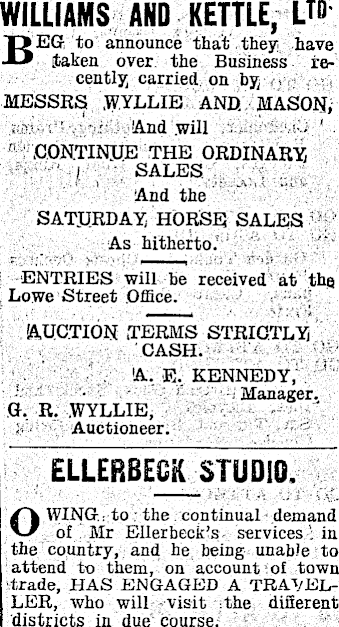 .WILLIAMS AND KETTLE, LTD BEG to announce that they have [taken over the Business recently carried on by MESSRS WYLLIE AND. MASON, • And .will ' CONTINUE THE ORDINARY I \ SALES And the SATURDAY, HORSE SALES As hitherto. ENTRIES will be received at the Lowe Street Office. AUCTION TERMS STRICTLY CASH. / • . ’A, E. KENNEDY, Manager. G, R. .WYLLIE, Auctioneer. ELLERBECK__STUDIO. O WING.; to the continual demand of Mr Ellerbeck’s services : in the country, and he being unable to attend to them, on account of town trade, HAS ENGAGED A TRAVELLER, who will visit the different districts in due course.