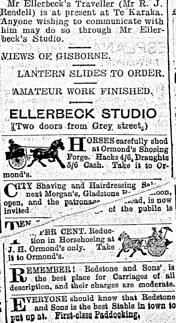Mr Ellerbeck’s Traveller (Mr R. J. Rendell) is at present at Te Karaka. £ Anyone wishing to communicate with : him may do so through Mr Ellerfceck’s Studio. KIEWS OF. .GISBORNE, LANTERN SLIDES ,T 0 ORDER, j AMATEUR WORK FINISHED, ELLERBECK STUDIO [(Two doors from Grey street;) mond’s. HOUSES carefully shod at Ormond’s Shoeing Forge. Haeks4/6 4 Draughts k 5/6 Cash. Take it to Or CITT Shaving and Hairdressing 8»V~nezt Morgan’s, Gladstone "_.oon, open, and the patronat"' *.uad, is now invited. _■ of the pnbllo is rr® I*' 1 *' EBB CENT. Keduotion in Horsehoeing at J. H. Ormond’s only, Take It to Ormond’s. X> EMEMBEBI Bedstone and Sons’ is |~fcj... the best place for Carriages of all description, and their charges are moderate. EVERYONE should know that Bedstone and Sons is the best Stable in town to pat up at. lirat'diess Paddosking,