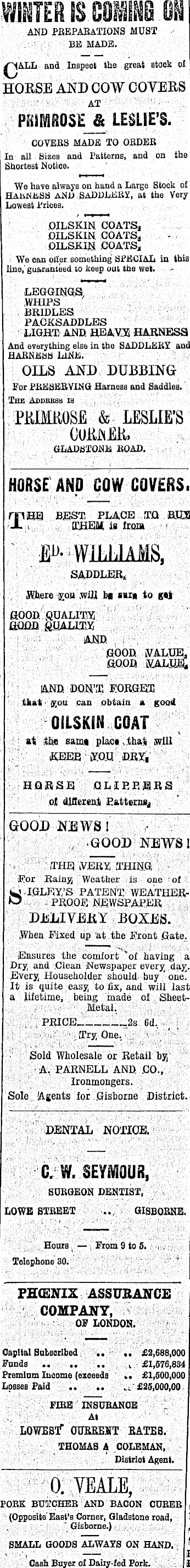 WHITER IS OOlie OH AND PREPARATIONS MUST BE MADE. £JALL and Inspect the great stock o£ HOUSE AND COW COVERS AT PRIMROSEj* LESLIE’S. COVERS MADE TO ORDER In all Sizes and Patterns, and on the Shortest Notice. We have always on hand a Large Stock of HABJSESS AND SADDLERY, at the Very Lowest Prices. .OILSKIN COATSj OILSKIN COATS d OILSKIN COATSj We can oiler something SPECIAL in this line,' guaranteed to keep out the wet. LEGGINGS. .WHIPS BRIDLES PACKSADDLES LIGHT, AND. HEAVY HARNESS And everything else in the SADDLEEY and HARNESS LINE. OILS AND DUBBING For PRESERVING Harness and Saddles. The Addbbss is PKIMKO&E & LESLIE’S GUKMK. GLADSTONE ROAD. HORSE AND COW COVERS. mna BEST, PLACE T.Q bus 1 , THEM is from &>■ WILLIAMS, SADDLER,, Where you .will ha iui to get good, .quality; GOOD QUALITY! AND GOOD, iVALUEj GOOD KALJIEj AND DON’T F.ORGET that you can obtain a good OILSKIN GOAT at the same place that will KEEP, YOU DRY, HORSE CLIPPERS of different Patterns^ GOOD NEWS 1 GOOD NEWS! THE .VERY THING For Rainy; Weather is one of W IGLEY/S PATENT WEATHER- - PROOF NEWSPAPER DELIVERY BOXES. .When Fixed up 'at the Front Gate. Ensures the comfort 'of having a Dry, and Clean Newspaper every day. Every Householder should- buy one! It is quite easy to fix, and will last a lifetime, being made of SheetMetal. PRICE _2s 6d. Try One. Sold Wholesale or Retail by, A. PARNELL AND. .CO., Ironmongers. Sole Agents for Gisborne District. DENTAL NOTICE. C. W. SEYMOUR, SURGEON DENTIST, LOWE STREET ... GISBORNE. Houra From 9to 5. Telephone 30. PH<ENIX ASSURANCE COMPANY, OF LONDON. Capital Subscribed. .. £2,688,000 Funds . £1,576,834 Premium Income (exceeds .. £1,500,000 Losses Paid .. .. £25,000,00 FIRE INSURANCE At LOWES f OUEBEST BATES. THOMAS A COLEMAN, Distriet Agent. 0. VEALE, • PORK BUTCHER AND BACON CUBER { (Opposite East’s Corner, Gladstone road, I Gisborne.) - SMALL GOODS ALWAYS ON HAND. n Cash Bnyer of Daiiy-fed Fork. bis