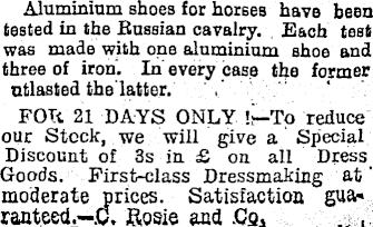 Aluminium shoes for horses have been tested in the Bussian cavalry. Each test was made with one aluminium shoe and three of iron'. In every case the former utlasted the latter. FOB 21 DAYS ONLY !—To reduce our Stock, tve will give a Special Discount of 3s in £ on all Dress Goods. First-class Dressmaking at ’ moderate prices. Satisfaction gua* ranteed.—C, Rosie and Co 3 ,