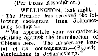 (Per Press Association.) WELLINGTON, last night. The Premier has received the following cablegram from Johannesburg to-day “We appreciate your sympathetic ■attitude against the introduction of 'Chinese here. The masses are fearful of its consequences.—(Signed), Australians iu Johannesburg.”